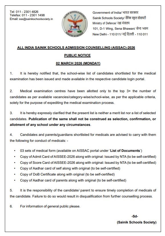 Admission to Sainik School is restricted to Class VI and Class IX. Selection of candidates will be done through the Entrance Exam (AISSEE) conducted by the National Testing Agency (NTA). Candidates are requested to visit the website https://exams.nta.ac.in/AISSEE/ for online application and other details.